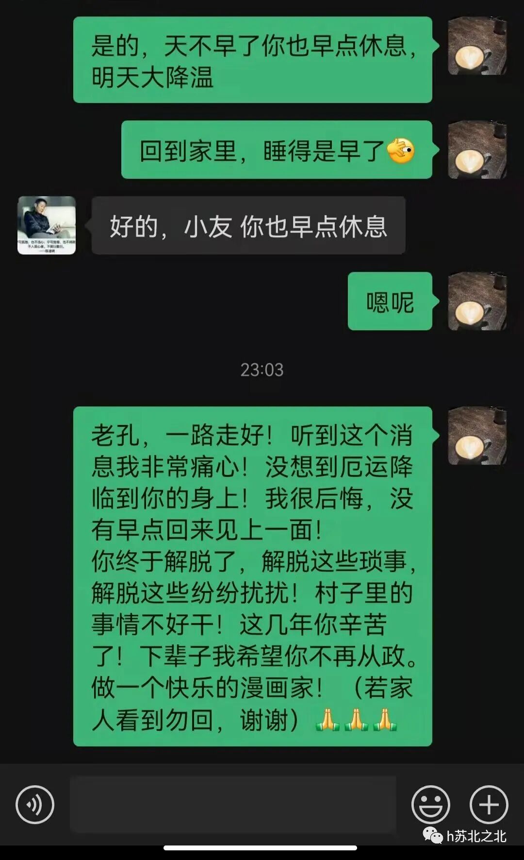 他还发给我一张截图,是他得知老孔离世后,心情悲痛,通过微信发给老孔的,尽管知道他们的孔书记再也看不到了: